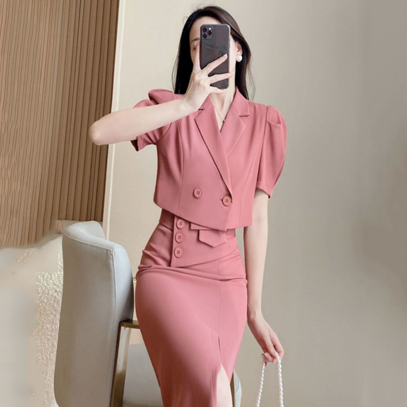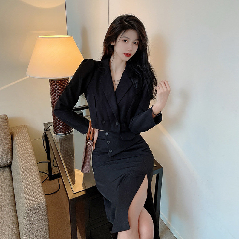 Women Design Button Slim Blazer 2 Piece Sets Office Lady Solid Double Breasted Short Blazers and High Waist Slit Skirt Sexy Suit