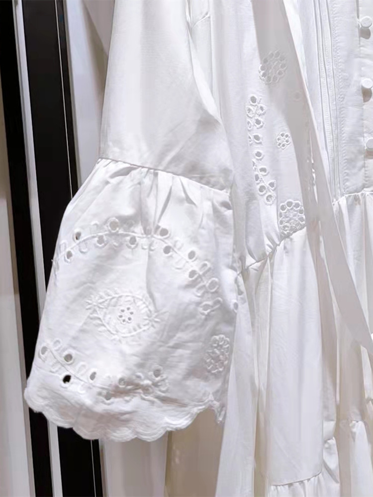 Women Hollow out Embroidery Dress White Bow Lace-up Temperament Front Button Simple Spring Ladies Midi Robe