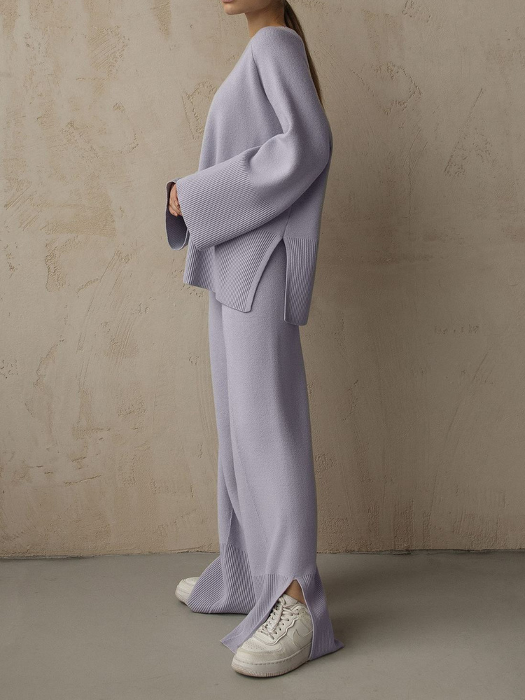 Women Knitted Pants Sets Lilac Casual Loose Two Piece Sweater Sets Autumn Winter Sweater Pullover and Wide Leg Pants Suits