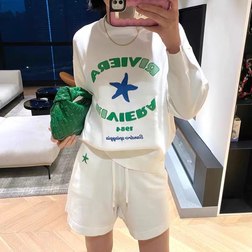Women Letter and Pentagram Embroidery Knitted Pullover Top + Elastic Waist Drawstring Shorts Set