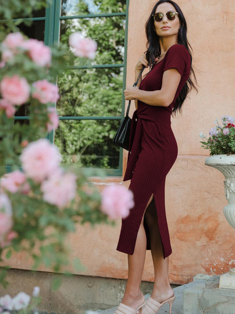 Women Sexy Strap Slit Dress Solid Color Short Sleeve Body Slim Casual Party Elegant Summer Female Girls Clothing