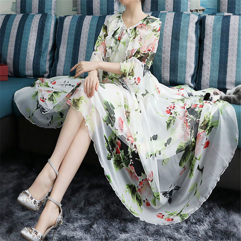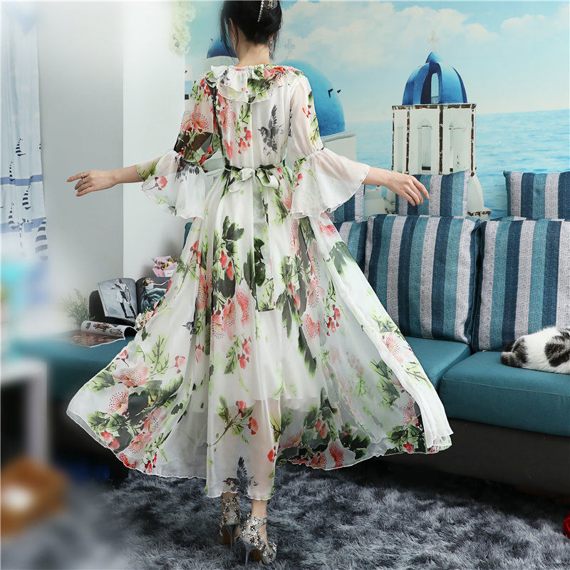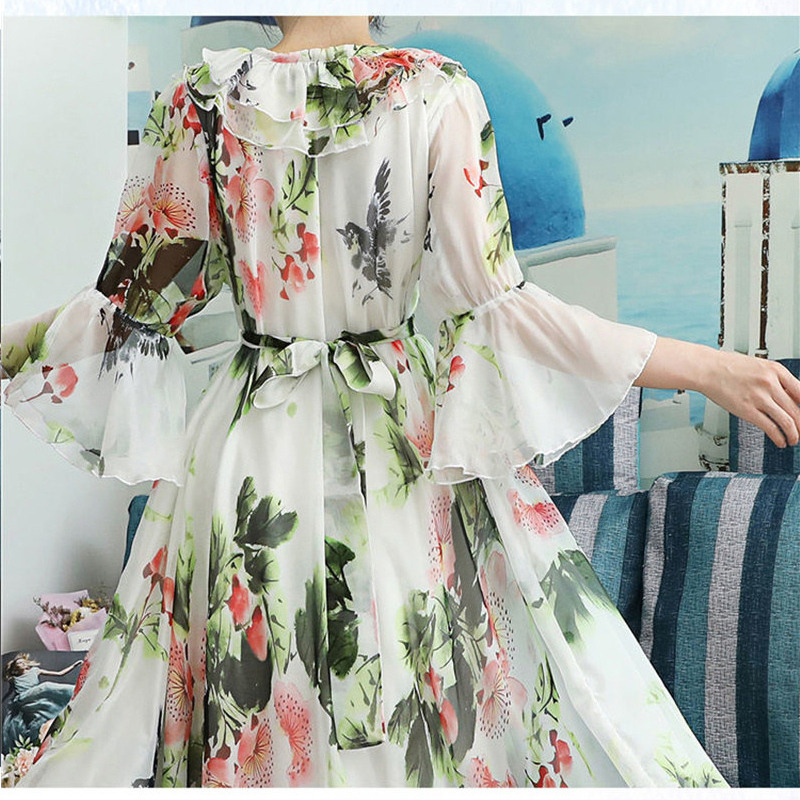 Women's Summer Fairy Elegant Floral Print Chiffon Party Long Dresses Ruffle Half Sleeve Lace Up A Line Maxi Dress Robe Femme
