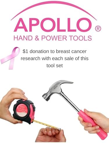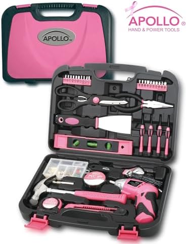 HOME DIY TOOL KIT: Whether you're hanging pictures in your new home or assembling a television stand in a dorm room, this kit puts everything you need for light- and medium-duty projects and repairs at your fingertips. This set includes tools carefully chosen for their usefulness in everyday household and DIY tasks so you will always have the right tool for the job. Tools are neatly stored in a sturdy case that keeps them secure, clean, organized, and easy to find. The case is easy to carry with its built-in handle; your tool kit can come with you wherever it is needed. THE UPGRADED 3.6 VOLT LITHIUM-ION RECHARGEABLE SCREWDRIVER packs a punch and is the perfect time-saving assistant. This powerful cordless screwdriver with forward/reverse mechanism allows for rapid tightening and loosening of screws. It features a bright LED to light up work areas. The power gauge lets you know when it’s time to recharge. CORDLESS SCREWDRIVER ANGLE ADJUSTMENT. For a more convenient reach depending on the situation, this cordless screwdriver's head has a useful pivoting feature. Push a button and the head rotates from straight to right angle. USEFUL HAND TOOLS: The set includes useful tools such as a claw hammer, adjustable wrench, long nose pliers and precision screwdrivers. It also comes with accessories to help you with your DIY and decorating tasks such as a putty knife for filling and smoothing holes and cracks in flat surfaces, a 100 piece wall hanging kit includes a wide assortment of pins, hooks and nails, a level and a tape measure will make sure the position and angle is perfect. Our hand tools are drop forged for strength; chrome plated to resist corrosion and have non-slip comfort grip handles for extra torque, and will last a lifetime under normal use. TOOL SETS ARE AN IDEAL GIFT IDEA and this particular set is a people pleaser. Tool sets make for a thoughtful housewarming gift, an original shower gift, a useful Christmas gift or graduation gift. Parents find it an empowering gift to give children as they leave the nest. Some of our customers are so happy with our pink tool set that they have given them as gifts time and time again. CANCER RESEARCH DONATION. A cause dear to our heart at Apollo Tools, we wanted a portion of every purchase to go directly to help breast cancer research. 1 dollar out of every purchase of this handy tool kit goes directly to benefit breast cancer research and cure. Contains: Dual-angle 3.6 Volt Lithium-Ion Cordless Screwdriver One Hundred Piece Fastener Set 18mm Utility Knife Ten 1" Bits CRV (1/8", 5/32", 3/16", 1/4", PH1, PH2, PH3, PZ1, PZ2, PZ3) Ten 1" Bits CRV (T10, T15, T20, T25, T27, T30, 1/8", 5/32", 3/16", 1/4") 2” Bit Connector 8" Scissors 8oz Claw Hammer Four Screwdrivers (Phillips No. 1, No. 0, Slotted 2.4mm, 3.0 mm) UL Electrical Tape 6" Long Nose Pliers 9" Plastic Magnetic Level 12 ft. 5/8" Measuring Tape 6" Adjustable Wrench 2" Putty Knife