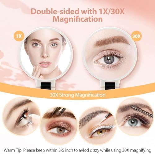 B Beauty Planet Hand Mirror, 30X Magnifying Mirror on Stand, Double Sided Magnifying Mirror with 30X/1X Magnification, 360°Adjustable Handle, Portable Travel Makeup Mirror for Eyebrow Plucking White
