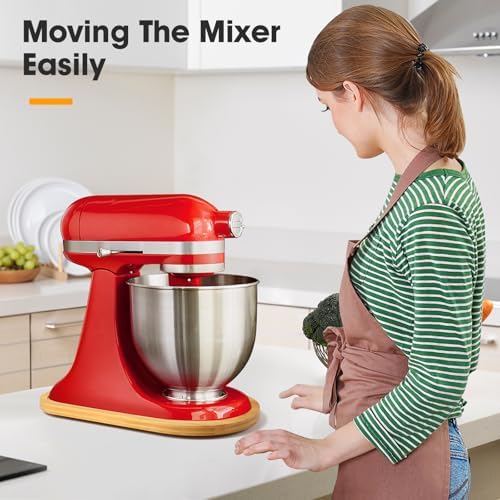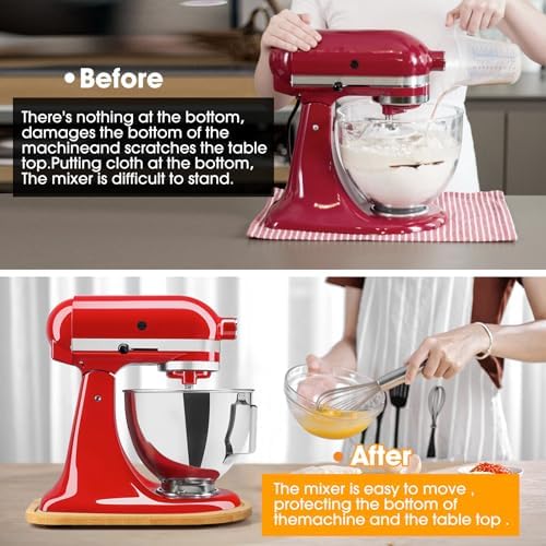 I ordered this to be able to slide my mixer on the counter without messing up my glass countertops and it does exactly that it slides so easily and it fits my mixer perfectly, there is no assembly needed its ready to use upon receiving, it wipes clean easily with a wipeor a damp rag the bamboo look is nice as well, did not ever think I would want this until I saw it surprisingly I never heard of it before but im glad I have it now saves my counters from scratches