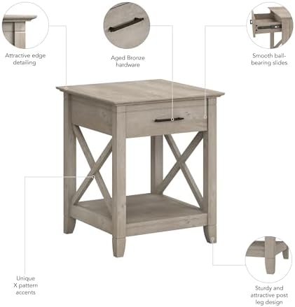 The Bush Furniture Key West End Table with Storage is a perfect way to bring the feel of a coastal retreat right to your living room. Highlighted by its unique X pattern accents and your choice of several casual finishes, this small side table is a natural fit in homes that embrace cottage and farmhouse styling. A box drawer organizes writing utensils, notepads, TV remotes and more while the lower shelf is perfect for storing reading materials and other household items. The surface offers more than enough room for a lamp, plant or decorations that give your space a personal touch. Use the 20W x 20D x 24H End Table on its own or build a complete living room furniture set with the matching Key West Coffee Table, 60W TV Stand and Console Table (coordinating items sold separately). This accent table has been rigorously tested to meet Bush Furniture's standards for safety, performance and durability and is backed by a 1 Year Manufacturer's Warranty. Browse the full Key West Collection for home furnishings with easy going style.