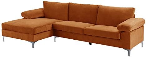 Family room / living room sectional sofa with an extra wide chaise lounge for maximum comfort Ultra soft and durable velvet fabric upholstery loose back pillows for a plush look and feel 5 people can sit comfortably in this couch Available in various fun and vibrant colors to best fit your home decor Plush and durable memory foam seat cushions Some assembly is required - Assembly instructions and hardware included
