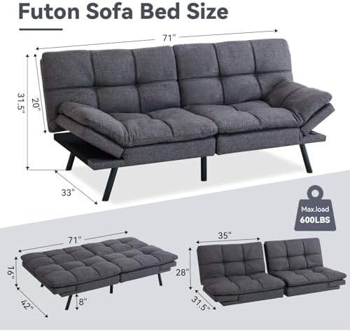 The futon sofa's serpentine springs and frame provide effective support to the sofa seat platform,makes this sofa bed sturdy enough to support 600lbs.