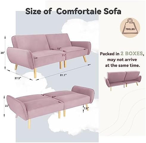 Crownland Futon Sofa Bed, Loveseat Sofa with Velvet Pillows, Mid-Century Modern Style Folding Sofa for Living Room, Bedroom, Apartment (Pink)
