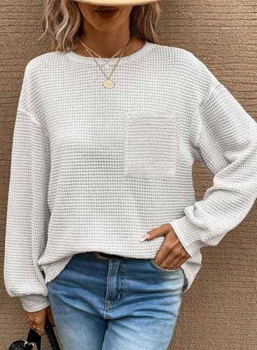 Dokotoo Womens Tops 2024 Oversized Long Sleeve Crewneck Waffle Knit Shirts Business Casual Blouses Basic Shirts