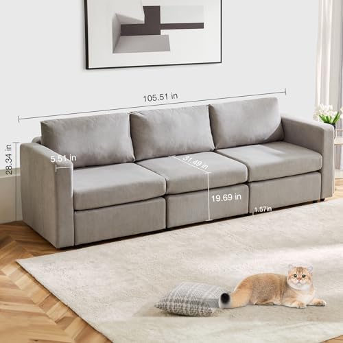 Modern Sleeper Sofa Couches for Living Room-113'' Beige 3 Seater Lounge Cloud Couch-No Assembly Required, Modular Corduroy Convertible Full Sponge Compression Sofas for House, Apartment
