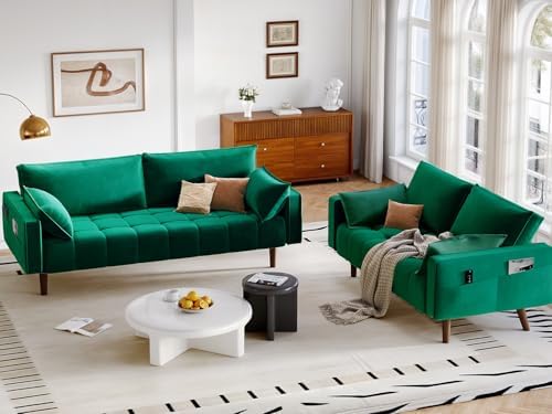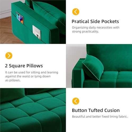 DWVO 70" Loveseat Sofa, Velvet Fabric Sofa Couch for Small Space, Modern Loveseat with Button Tufted Seat and Side Storage Pockect, 3 Seater Couch for Living Room Bedroom, 2 Pillows Included, Green