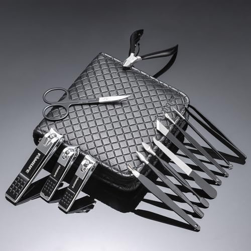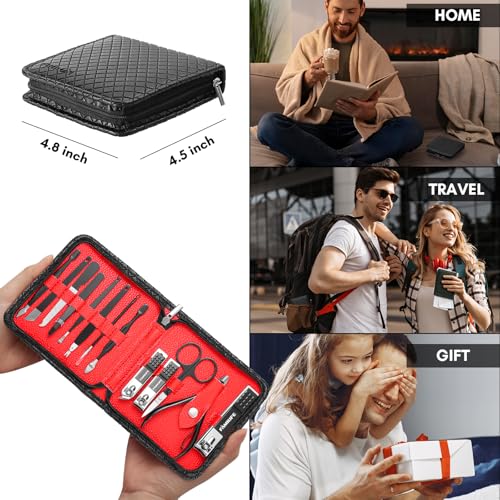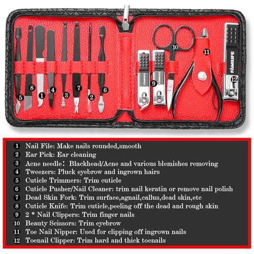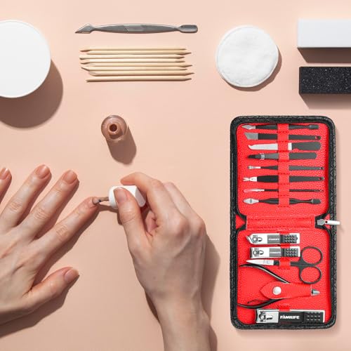 FAMILIFE Nail Kit, Professional Manicure Set Manicure Kit Nail Clipper Set, 13 in 1 Stainless Steel Pedicure Set Nail Clipper Kit, Men Grooming Kit with Portable Black Leather Travel Case for Him
