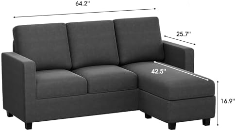 Flamaker Sofa, Sectional Couch with Reversible Chaise, Fabric Small Sofa for Living Room, Dark Grey, 64.2x42.5x16.9 inches, 660lbs Weight Capacity