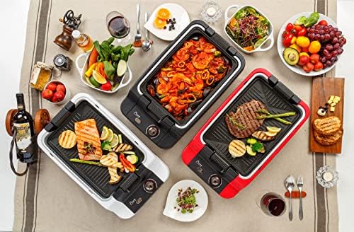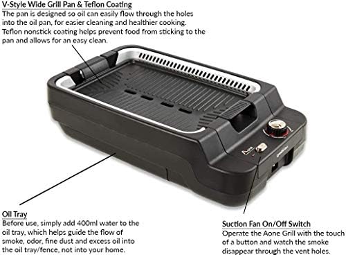 Smokeless, electric grill for cooking delicious food indoors, with just the push of a button. Using Aone Grill’s proprietary technology, most of the oil and dust are filtered through the grill, leaving your home smoke and odor-free. **PLEASE NOTE** The most common troubleshooting issue we hear from customers is that the fan does not work or the grill does not heat up. When reassembling the grill after cleaning, make sure the arrows on the silver tray are facing the control panel. If the tray is not assembled properly, the grill will not heat up and the fan will not work. Material: Aluminum Teflon Coating / Heat Resistant Plastic / Stainless Steel // Rated Voltage: 110-120V // Power Consumption: 1200W