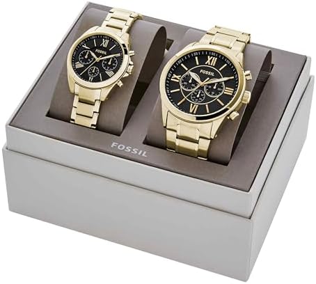 Designed in polished gold-tone stainless steel, this his and her duo gift set includes the best of both worlds—the everyday Flynn chronograph for him and the Modern Courier chronograph for her.