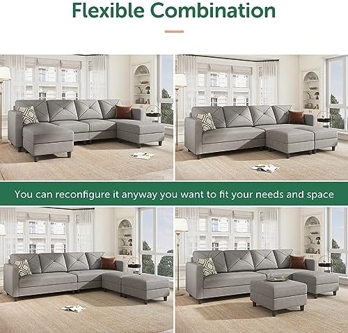 HONBAY U Shaped Sectional Couch Convertible Sectional Couch with Double Chaise 4 Seat Sectional Sofa for Living Room, Light Grey
