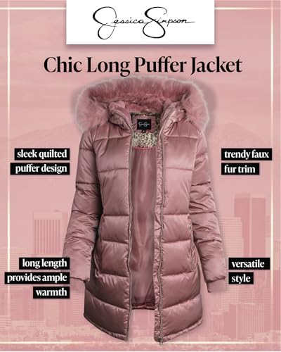 Jessica Simpson Women's Long Puffer Jacket - Quilted Winter Coat with Faux Fur Trim Hood - Insulated Coat for Women (S-XL)