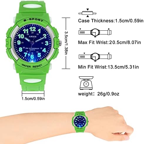 Specification: Band Width: 0.63 in / 1.6 cm Band Length: 8.66 in / 22cm Case Thickness: 0.59 inch /1.5 cm Case Diameter: 1.38 inch / 3.5 cm Max Perimeter: 8.07 in / 20.5 cm Min Perimeter: 5.31 in / 13.5 cm Product Weight: 0.9 OZ / 26 G Battery Code: SR626SWWhat you get in the package ? 1*Kids analog watch 1*Presents box1 *ManualAttention: 1.Please avoid the use in extreme hot or cold temperature. 2.Clean the strap by a soft cloth on regular bases is highly recommended. 3.Too much water contact will shorten watch life. 4.Different computer monitors are different, the color may be slightly different, but the color of the watch is guaranteed to be correctManual measurement has a deviation of 1-3cm. Thanks for your understanding.
