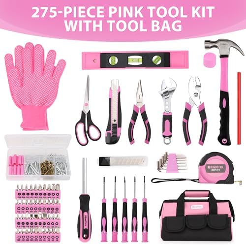 275-piece pink tool set: wrench, Allen key, claw hammer, level, screwdriver, screwdriver bit, tape measure, utility knife, pliers, scissors Batteries Included?