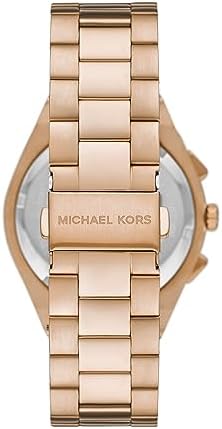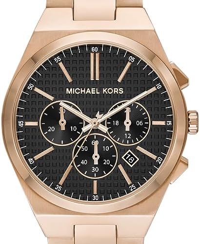 Michael Kors' 41mm Lennox watch features a black textured dial, chronograph movement and beige gold-tone stainless steel bracelet.