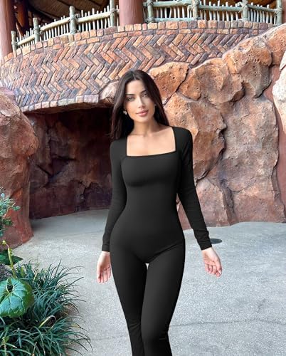 OQQ Long Sleeve Jumpsuits for Women Ribbed Long Sleeve Yoga Bell Bottoms Flare Jumpsuits