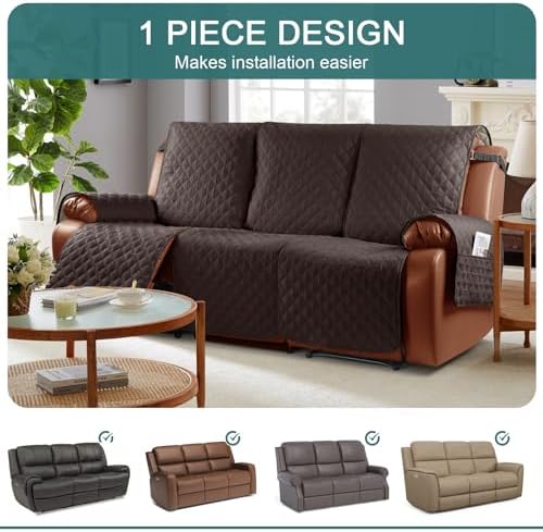 I am very happy with this Ruozz microfiber slipcover for my power reclining couch.It fits nicely and stays in place as expected though it must be adjusted occasionally with use.The quilted material is thicker and higher quality than most.I like the one piece design and installation was fairly easy.I wish there were straps across the footrests to hold them in place but other than that…perfect!The khaki color looks nice and is really closer to being a taupe in my opinion which I actually prefer.Very pleased with this purchase.