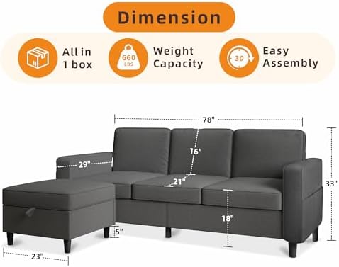 The ottoman can be placed left or right to form reversible sofa, can also be used as a storage box alone. Convenient for you to store remote controls, magazines or other small items.