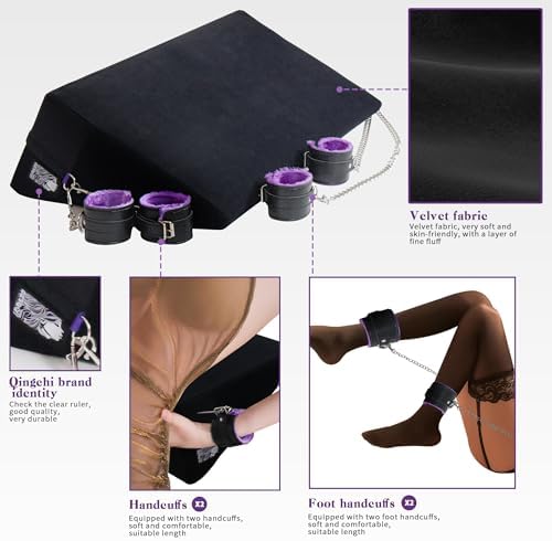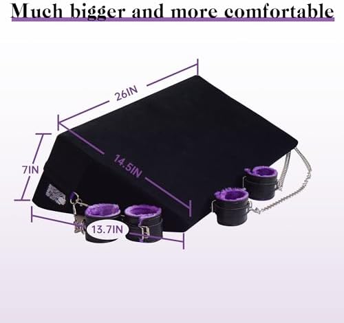 This is an upgraded version of the 26-inch large multifunctional sex wedge positioning pillow, which can be suitable for most body types. What’s interesting is that we have equipped it with a pair of erotic handcuffs and a pair of erotic anklets. Use it to bind your lover, adding more stimulation and pleasure to your sexual life and fully enjoying sexual happiness! The fabric is made of super soft velvet fabric, which feels very comfortable and soft against bare skin, and is removable and machine washable. The water-proof polyester lining keeps the sponge dry, in top shape, and odor-free. After market research, we combined the voices of most consumers and through our own repeated testing, we upgraded the sponge to a 75D high-elastic sponge, which can support up to 300 pounds and maintain elasticity at all times, with moderate hardness and softness, and support. It also makes the body feel particularly relaxed. When trying various angles and positions, the 28-degree angle base can provide more help, helping the body to better insert the G-spot, improving sexual pleasure, and preventing the body from being sore during long-term sexual intercourse, oral sex, and anal sex. In order to reduce transportation costs and support environmental protection, we use vacuum compression packaging for transportation, and the outer packaging will not reveal any product information, protecting your privacy. After receiving the product, please open the outer packaging and let it rest to restore it to its original state. If you have any questions about the product, please contact us in time.