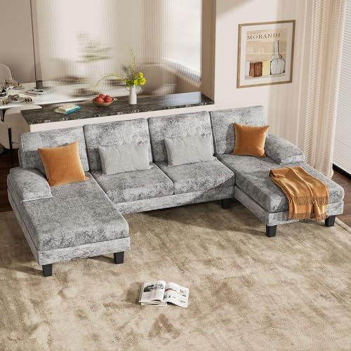 Shahoo U-Shaped Sofa Feature: Shahoo Sectional Couch Living Room Sets, Chenille Fabric U-Shaped Sofa with Double Chaises, Dark Gray. Specification Color: Dark Gray Material: Wood, Chenille Fabric, etc Package Dimensions:110"(L) x 44.1"(W) x 33.4"(H) Package includes: A sofa A tool kit A manual of installation and usage Notice: There may be some differences between photos and items in term of color because the influence of lighting during the shooting or the settings of the computers’ display screen.