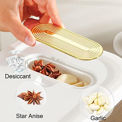 Built-in Fresh Box.The rice dispenser with a built-in fresh box,you can put some star anise, garlic, cloves, bay leaves, and desiccant in the fresh box of the rice storage container, keeping your food naturally fresh and protected at all times.