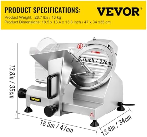 This food slicer is made of cast aluminum body and 8.7'' chromium-plated steel blade, with a painted surface, corrosion and rust-proof. The 240W powerful motor provides high-efficient production. An equipped regulator can adjust the thick of slicers between 0-0.47 inch/0-12 mm. It adopts a detachable design for easy cleaning. It is a perfect turkey deli meat slicer, bread slicer, deli slicer, and salad shooter.