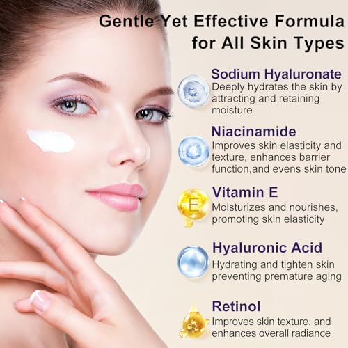- Our skincare routine kit provides everything needed for younger-looking skin, including a facial cleanser, toner, eye cream, serum,face cream and body & neck lotion. The cleanser and toner gently cleanse and hydrate while restoring the skin barrier. The face cream, serum, eye cream, and neck lotion work together to hydrate,moisturize,anti-aging,firm,tighten,improving elasticity and enhance skin tone. Infused with premium ingredients like retinol, sodium hyaluronate, vitamin E, and glycerin, the products are cruelty-free and sulfate-free, suitable for all skin types, including sensitive skin
