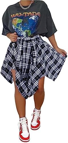 Women's Plaid Skorts Skirts - High Waisted Tie Front Pleated Summer Asymmetrical Skirt with Shorts