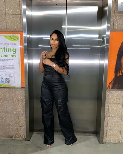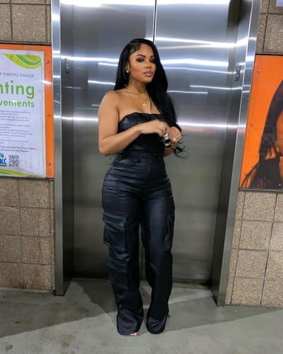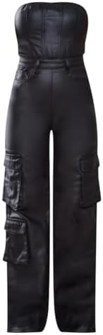 Womens PU Leather Jumpsuit Sexy Off the Shoulder Top Tight Waist Cargo Pants Bodysuit