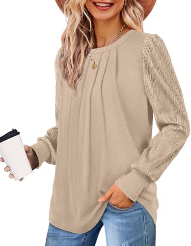 XIEERDUO Women's Long Sleeve Shirts Pleated Crew Neck Puff Sleeve Tunic Tops