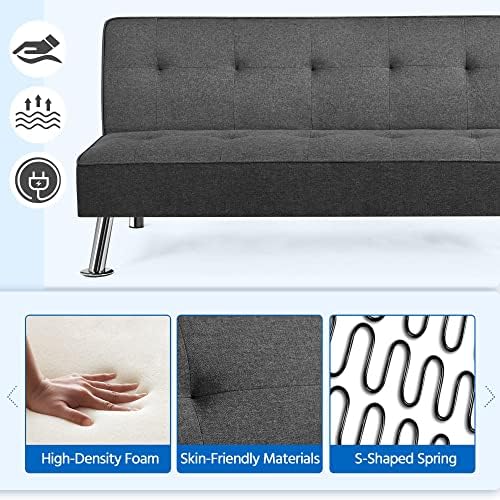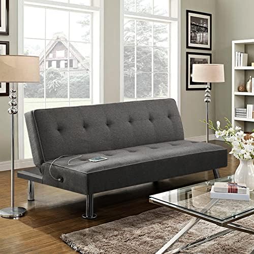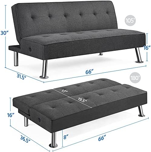 Functionalityand aesthetics meet harmoniously in this convertible futon bed. It cannot only provide a comfortable platform bed for 2 guests to sleep on,but it’s also a decent sofa and lounge for 3 adults in your home orapartment. This futon is made of wear-resistant polyester fabricupholstery, soft foam fills and stout chrome-plated legs, which caneasily hold up to 350kg/772lb. The two handy side-mounted USB portsoffer even more convenience to charge your electronics without leavingthe comfortable seat. Simple assembly is needed.