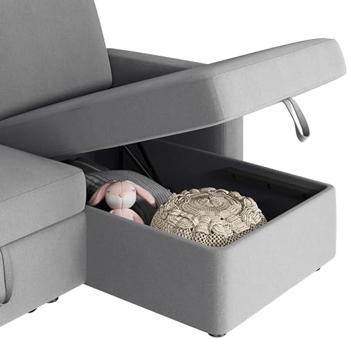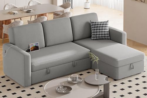 Maximizingspace in a room where every inch matters can be challenging, but notwith this L-shaped Convertible Sectional Sofa. It solves yourspace-saving needs by effortlessly transitioning from a compact L-shapedsofa with a chaise to a spacious double bed for two. With a roomystorage chaise, you can neatly store blankets and pillows under theseat, keeping them clean and out of sight. Better yet, you have theflexibility to set the chaise on the left or right of the loveseat toaccommodate your space requirements. This sleeper sectional sofa isequipped with 1 USB-A port and 1 Type-C port for more convenience.Simple setup required.
