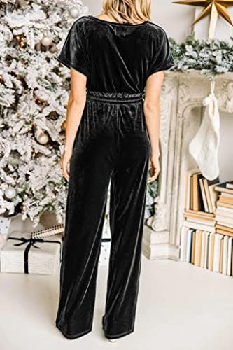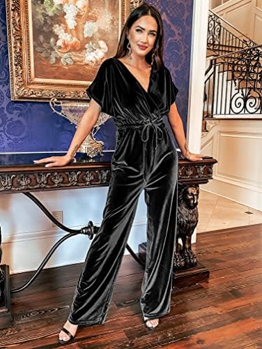 - Features: bateing half sleeve,long pant, jumpsuit, wide leg ,side pockets, high waist, elastic waist, waist tie, short sleeves, deep V-neck, solid color fabric, the surface of the fabric has a layer of shiny fluff, making the whole dress more elegant ,noble.