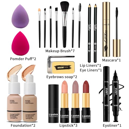 Makeup Kit Sets for Teens Women Full Kit with Bag,All in One Make-Up Gift Set Including 20 Colors Neutral Eyeshadow Palette,Lip Glosses,Eyeliner,Mascara,Eyebrow Pencil,Foundation,Brushes & More Kits
