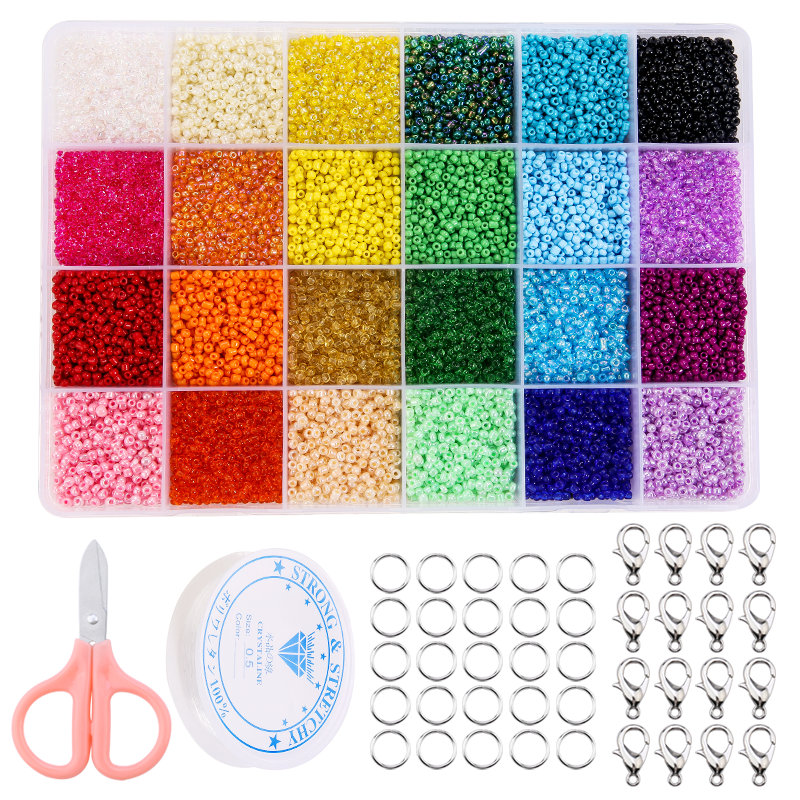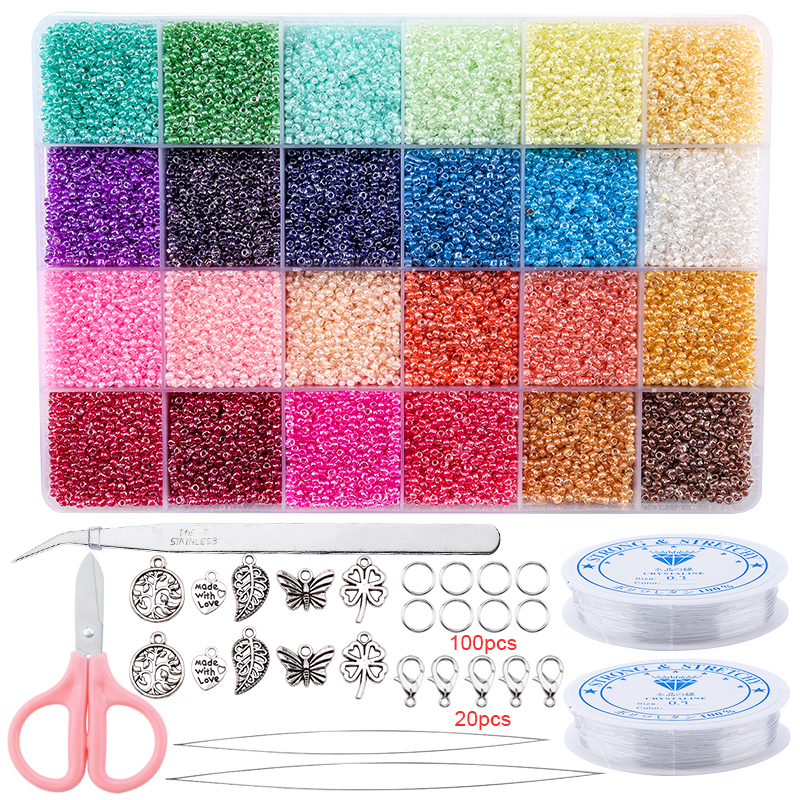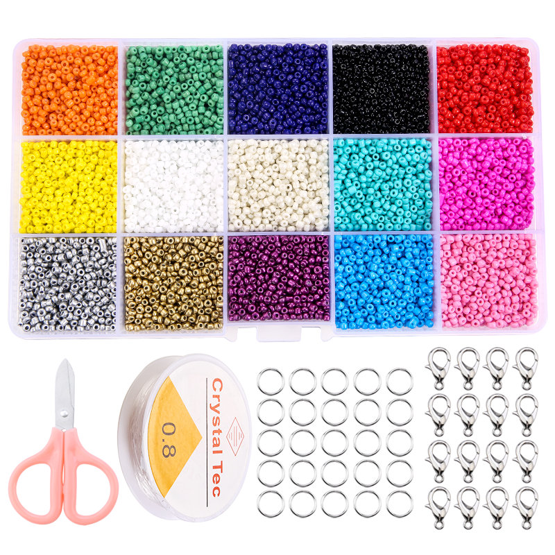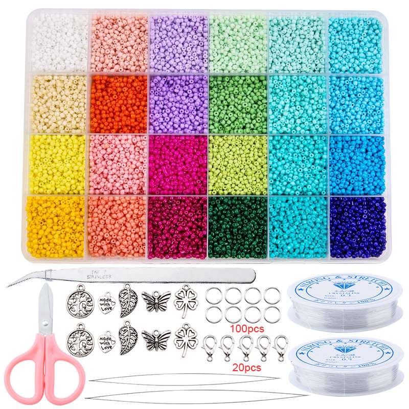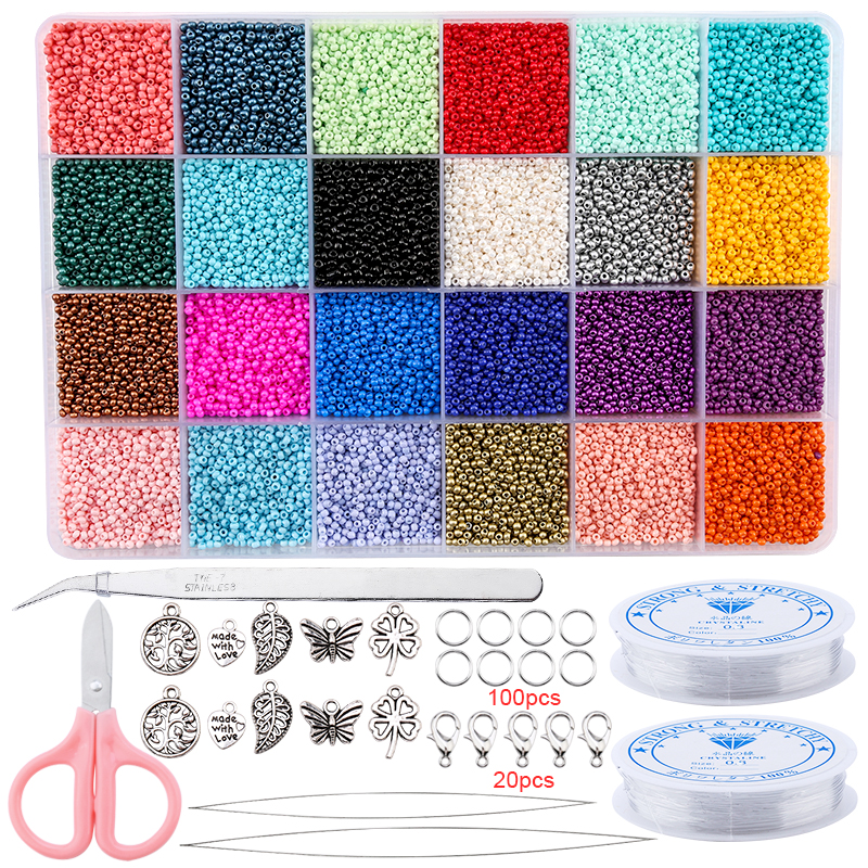 Glass beads set include 20000 pcs 2mm various colors seed beads with storage box, 2 rolls clear elastic thread, 100 pcs jump rings, 20 pcs claw clasps, 1 pcs scissors,2 pcs needles,1 pcs tweezer.