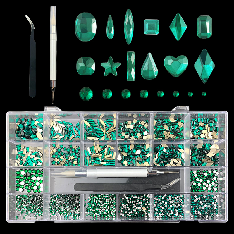 2). 2740pcs Rhinestone set: 240pcs(20x12) k9 crystal glass rhinestones, 2500pcs mix sizes round rhinestones,1pcs wax pen(Crystal or white), 1pcs tweezers for free