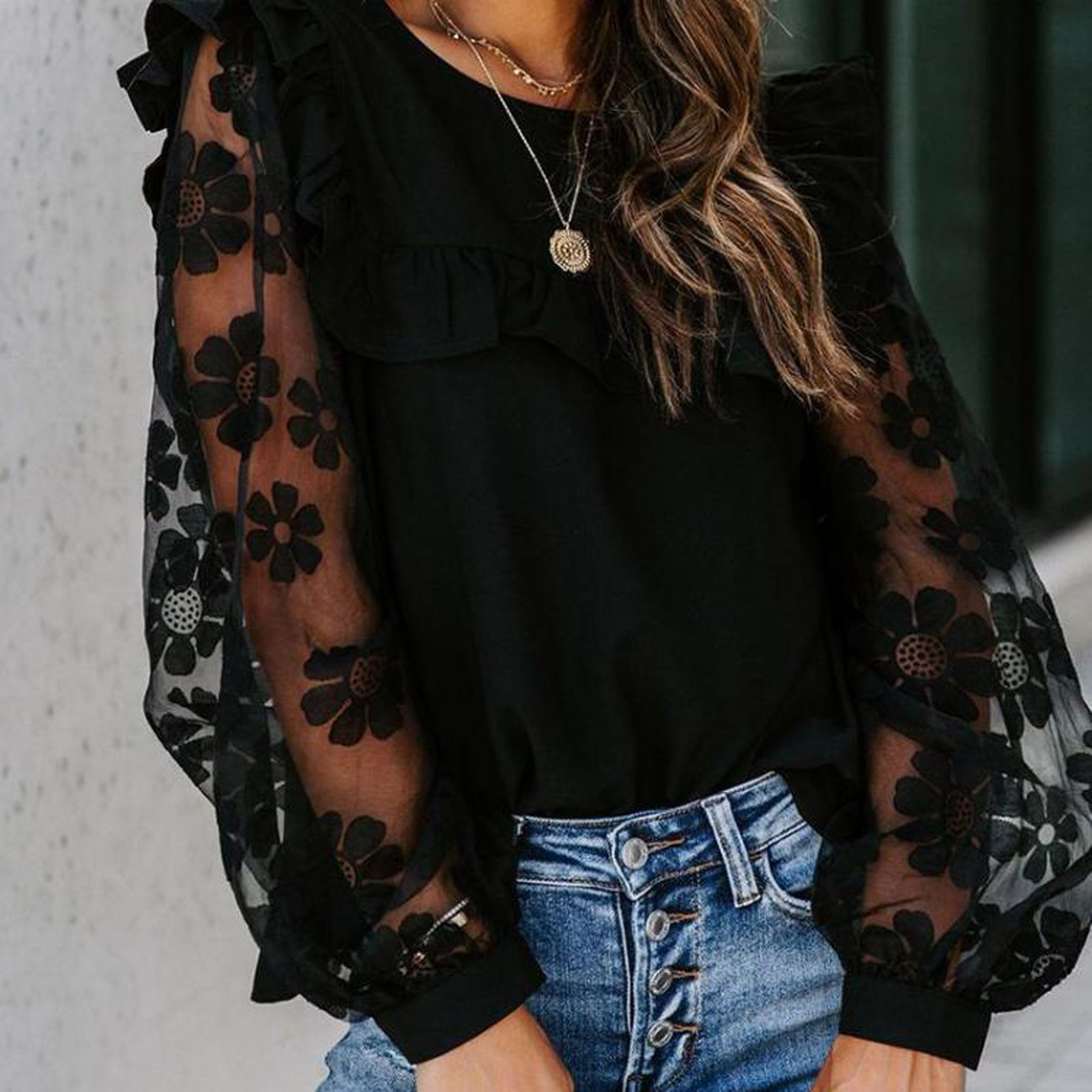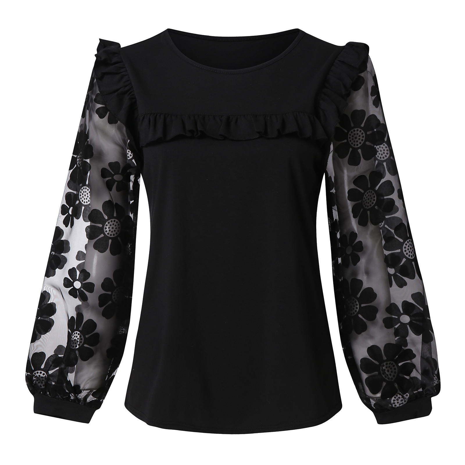40# Women's Ruffle Blouses tops Net yarn Round Neck Lace Patchwork Long Sleeve Blouses Top Mesh Gauze sexy Retro Shirts рубашка