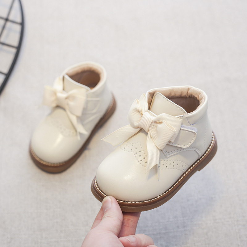 2021 Anti-slippery Genuine Leather Baby Girls Boots with Butterfly-knot Casual Flat Heel Autumn Winter Baby Girl Shoes E08044