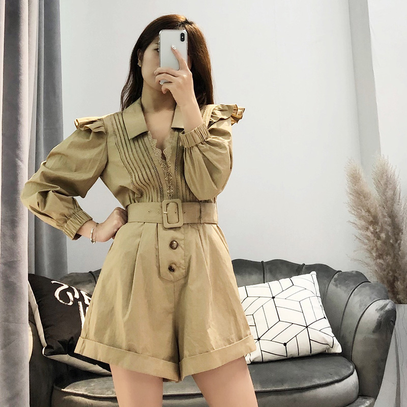 BUSHRA Casual Patchwork Lace Women Short Jumpsuit V Neck Lantern Short Sleeve High Waist With Sashes Hollow Out Playsuit Female