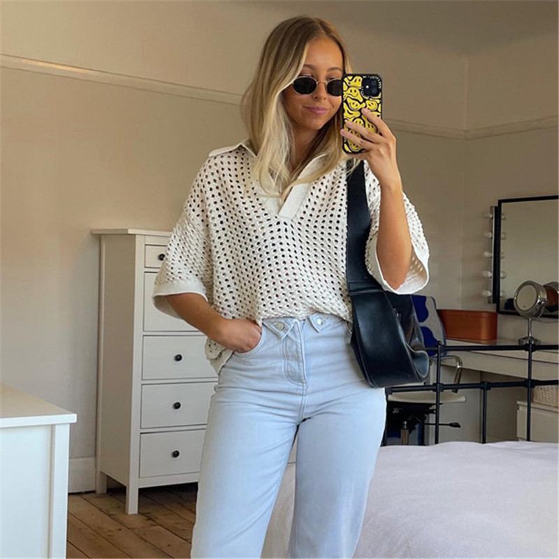 Basic Knitted Hollow Polo Women Short Sleeve Top Loose Casual Solid Color Polo Shirt Women Street Outfit Spring Summer シャツ
