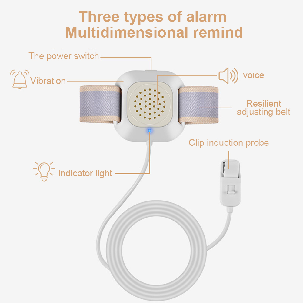 This is a very user-friendly design product with a bedwetting reminder function for infants and young children. When the bedwetting occurs, a sound and vibration signal are emitted, so as to remind adults to know and take measures that are beneficial to the baby's health in time. The reminder device has high humidity sensitivity, and the response is fast and sensitive. The product is compact and easy to wear, just clamp the control head in a position where it can be detected. With it, adults can easily find out the dryness and wetness of baby's diapers