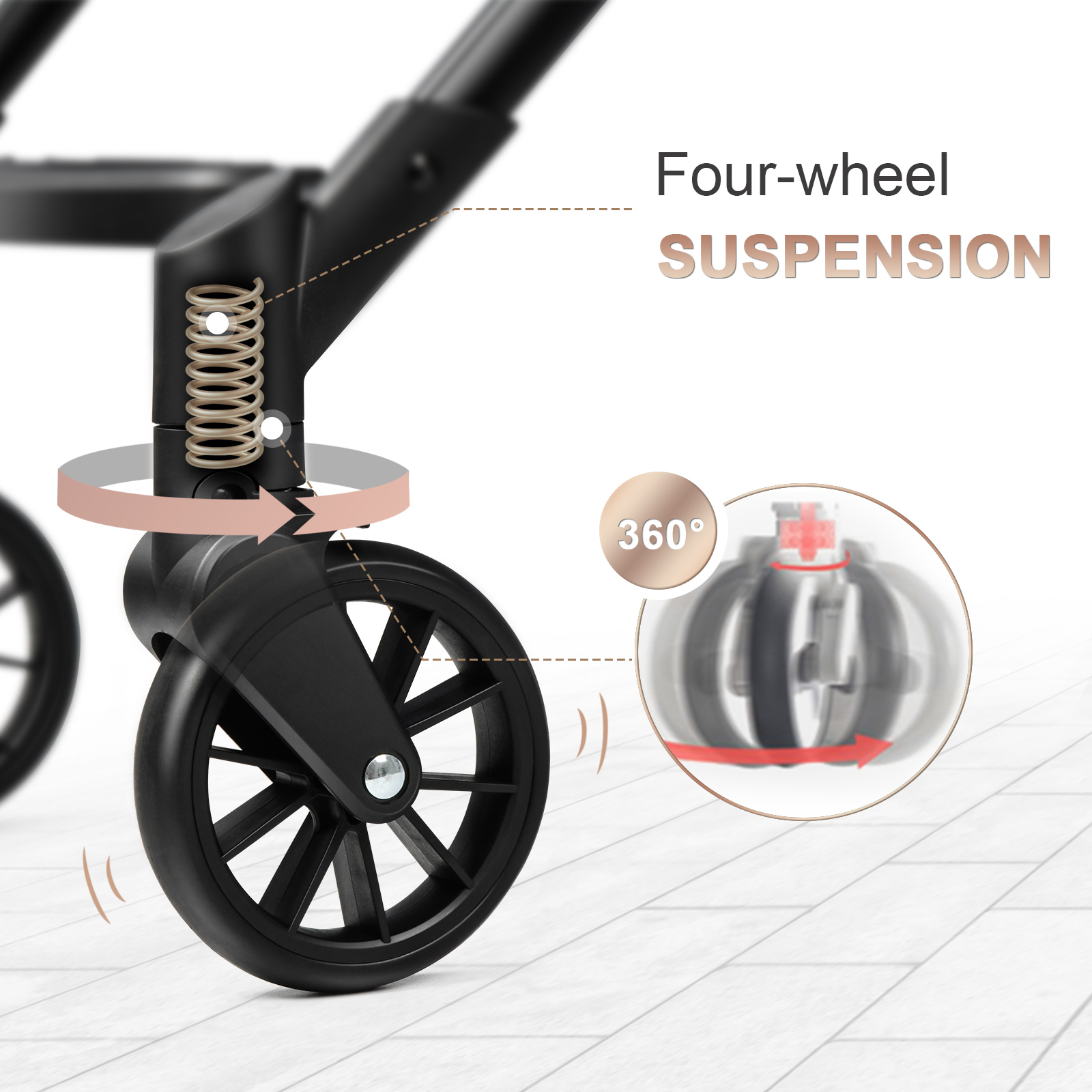 STABILITY - The pushchair's spring-loaded shock absorption system with highly elastic, shock-absorbing, and durable tires provides excellent cushioning and shock absorption, protecting your baby's underdeveloped spine and neck. Quiet and stable for your walks and excursions