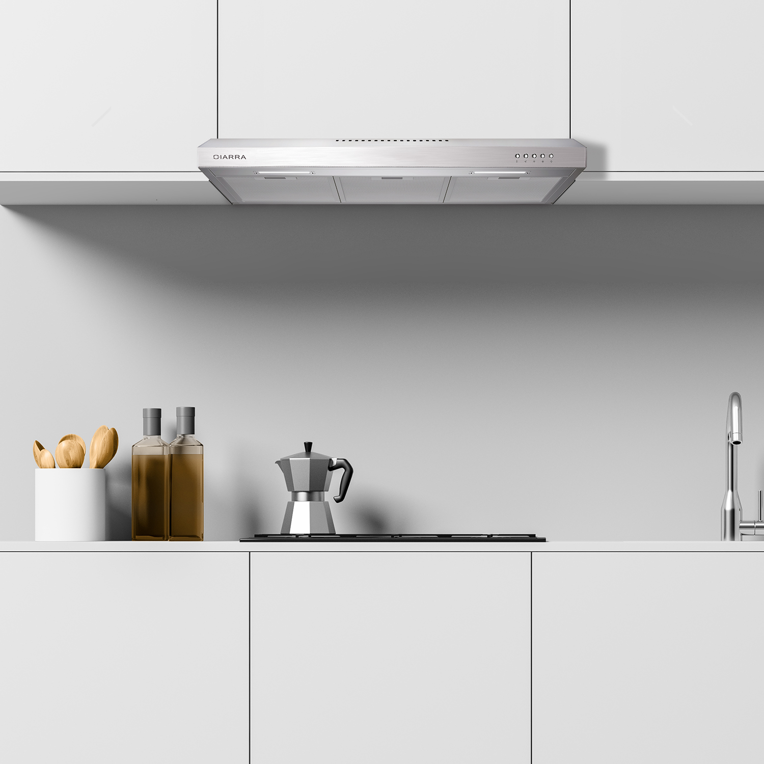CIARRA under cabinet range hoods ensure powerful ventilation performance for an odourless and fume-free kitchen.