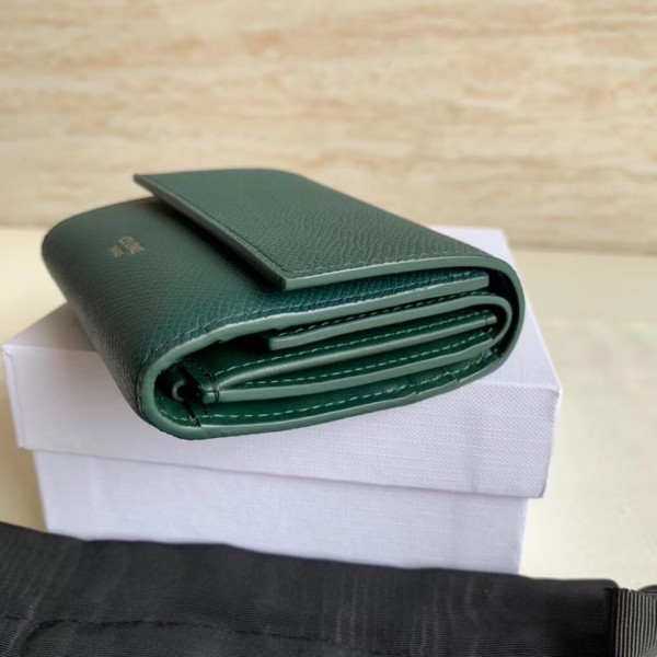 Crafted in grained calfskin leather by the House of Celine, this small trifold wallet with a flap offers enough space to fit into even a tiny bag or clutch, yet with space for coins, notes and credit cards, this neat wallet is the ultimate mini companion. Coupled with an elegant design with golden finishing touches.